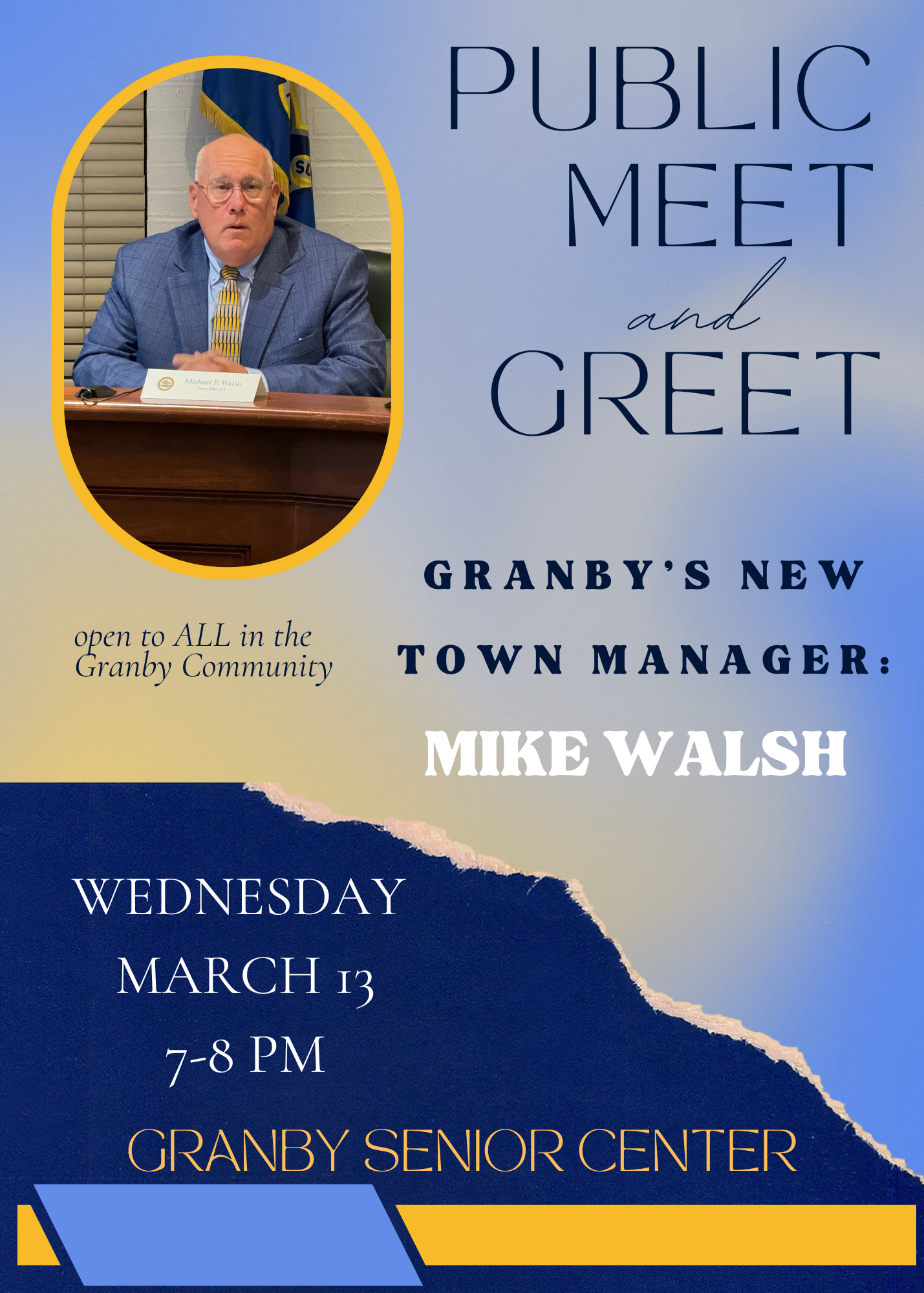 Attached below is the invitation for the public, open house Meet and Greet with Granby's new Town Manager, Michael Walsh.