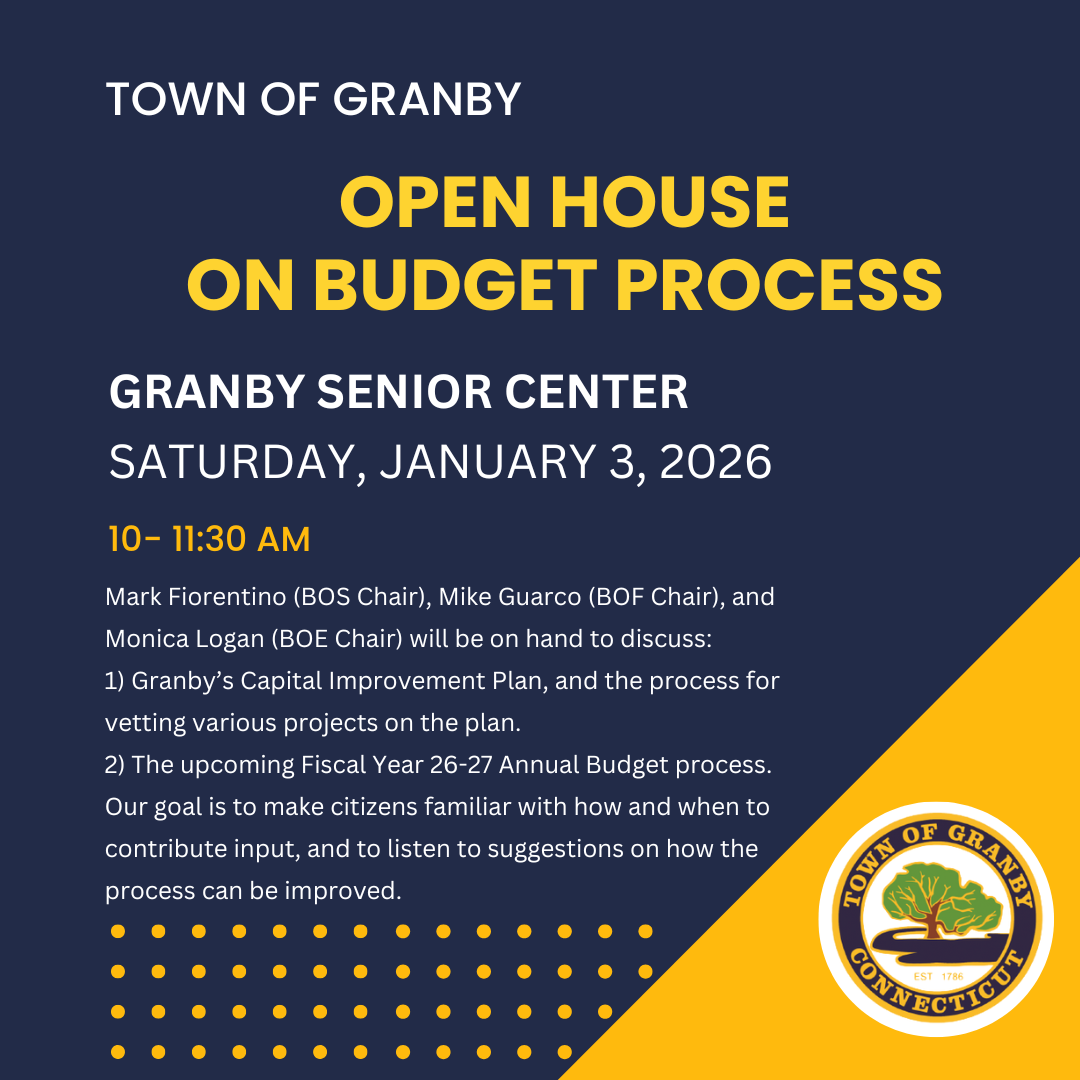 There will be a Open House on the Budget Process with Granby's elected officials on Saturday, January 3, 2026, from 10:00 - 11:30 AM at the Granby Senior Center.